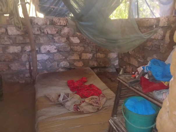 Die 4-jährige Mary ist das jüngste Kind einer Familie mit 7 Kindern. Sie hat zwei Schwestern und 4 Brüder, die alle frühzeitig die Schule verlassen mussten, weil die Eltern keine Gebühren zahlen konnten. Die einzige Hoffnung war, dass Mary einen Schulplatz bei uns bekommt. Vater Karisa findet als Tagelöhner kaum Arbeit, Mutter Fatima sucht Feuerholz und geht weiter Strecken, um ein Bündel verkaufen zu können. Auch um Wasser muss sehr weit gegangen werden. Die 2-räumige Lehmhütte der Familie, welche ca 5km von der Schule entfernt ist, hat 2 Räume und ein Wellblechdach. Es gibt nur einen Plastikstuhl und einen behelfsmäßigen Tisch als Ausstattung.