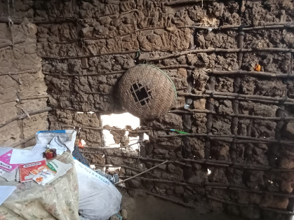 Nasra wohnt mit ihrer Mutter Grace (28 Jahre alt), den 3 Brüdern in einem Raum der Lehmhütte. Einzige Ausstattung ist ein Bettgestell mit einer alten Matratze, die vor vielen Jahren gespendet wurde. Grace verkauft gelegentlich Gemüse.